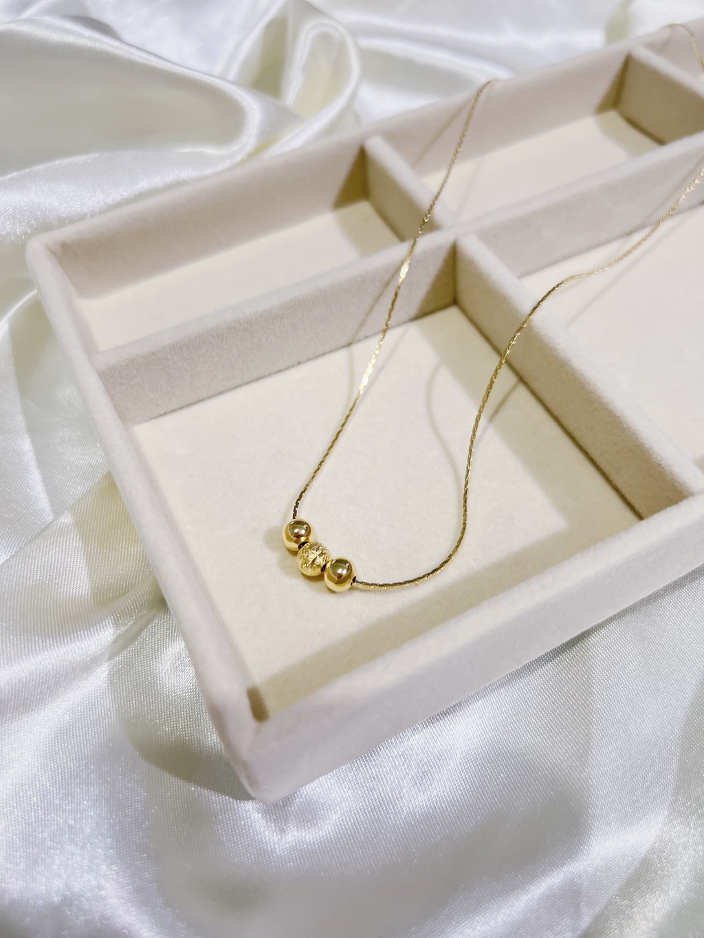 Um colar delicado que traduz sofisticação em sua forma mais pura. As três esferas, com acabamento refinado, criam um design minimalista que adiciona um toque de elegância discreta ao colo. O fio laminado banhado a ouro 18k garante brilho e durabilidade, ideal para complementar qualquer look com leveza e charme.